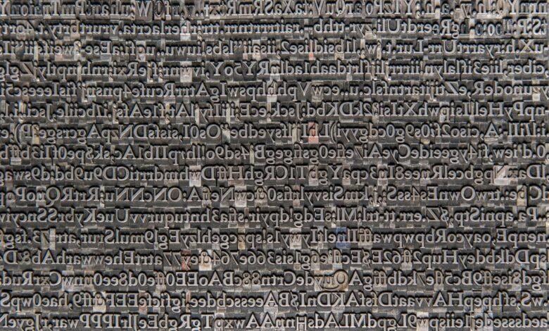 Old metal printing letters used for traditional letterpress text printing.