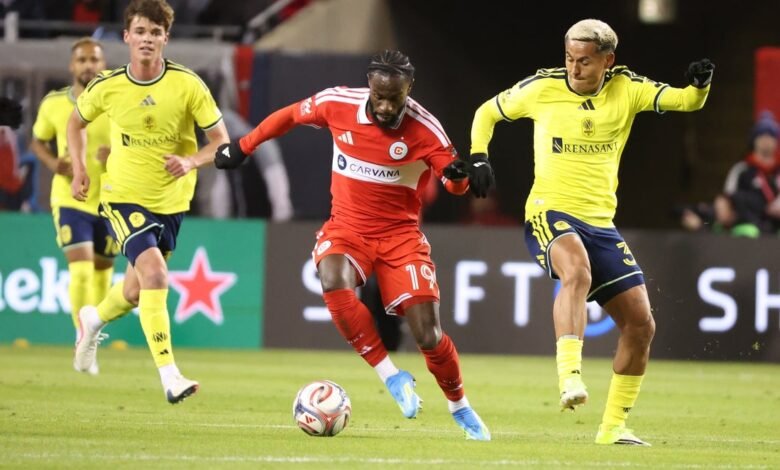 Apr 4, 2026; Chicago, Illinois, USA; Chicago Fire FC forward Jonathan Bamba (19) and Nashville SC defender Andy Najar (31) battle for control of the ball during the first half at Soldier Field. Mandatory Credit: Talia Sprague-Imagn Images The Chicago Fire don’t appear to have lost confidence despite an injury to their star striker.