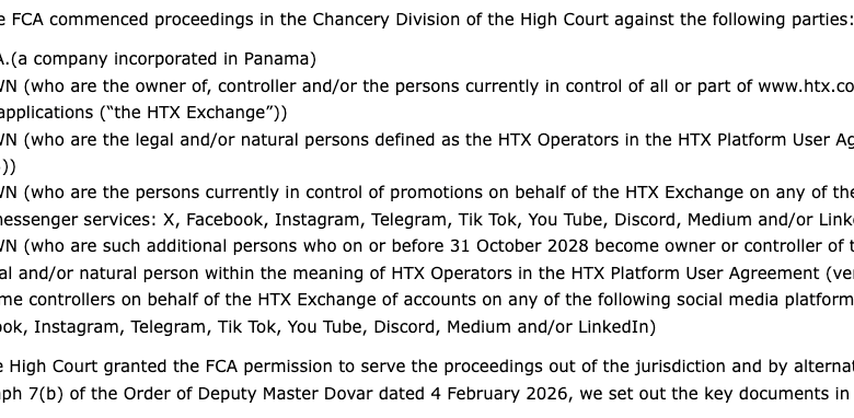 The UK Financial Conduct Authority (FCA) said it began proceedings against HTX and several related persons in the Chancery Division of the High Court in October 2025.