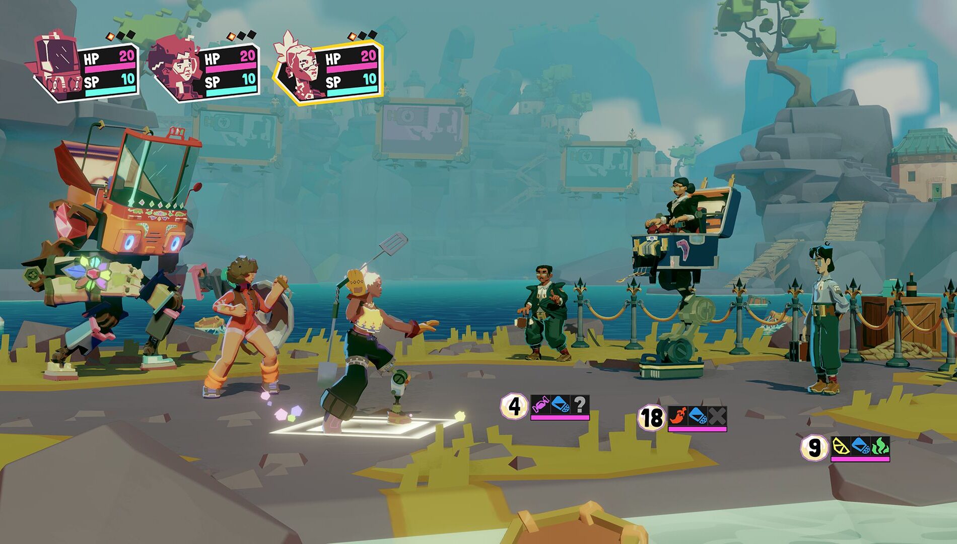 In order to keep this approachable for everyone, regardless of your experience with turn-based combat or JRPGs, the type matching is kept simple. Spicy attacks will lower shields on enemies weak to Spicy attacks, and so on. When an enemy’s shield breaks, they are Stuffed or stunned for a number of rounds, letting you do massive damage. You don’t need to memorize a weakness chart as everything is laid out for you.