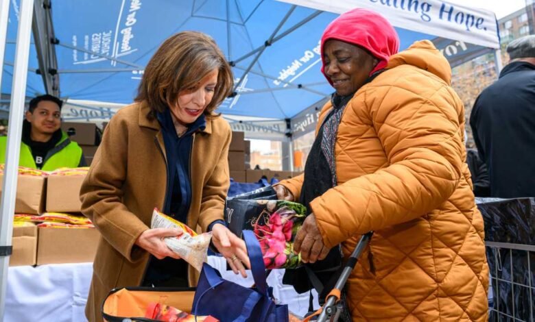 At its Harlem outpost Tuesday, Catholic Charities welcomed Gov. Kathy Hochul (pictured above with food recipient) and Cardinal Timothy Dolan (not pictured) to its Thanksgiving food distribution program.