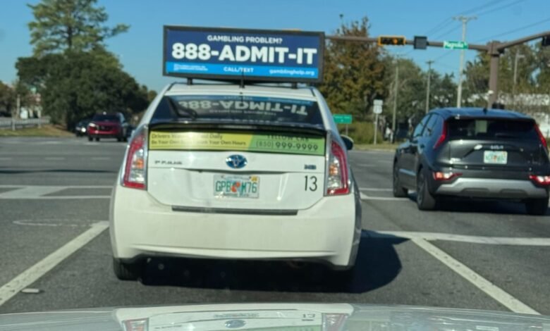 A digital billboard atop a taxi in Florida advertises the 888-ADMIT-IT problem gambling helpline. The toll-free number connects callers with the Florida Council on Compulsive Gambling. (Image: Florida Council on Problem Gambling)