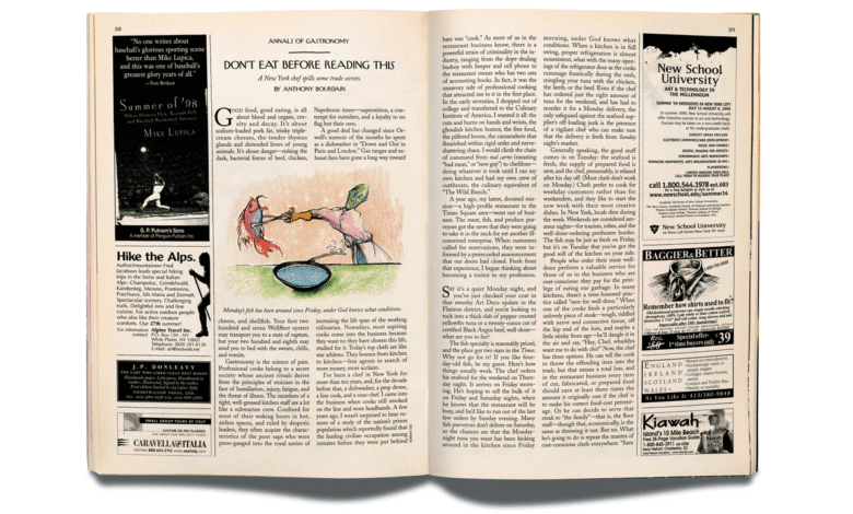 Bourdain’s elaborate passage explaining why this was true had first been published, in The New Yorker, in the 1999 essay “Don’t Eat Before Reading This,” which he expanded, rapidly, into “Kitchen Confidential.” (The short answer was that “many fish purveyors don’t deliver on Saturday, so the chances are that the Monday-night tuna you want has been kicking around in the kitchen since Friday morning, under God knows what conditions”; the long answer took you deep into the culture and psychology of the restaurant business.) He wrote it, originally, for an alt-weekly called the New York Press, which had slated it as a cover story before the editor killed it at the last minute. Bourdain had imagined his audience would be insular and small: “I thought, I’m going to write something that will entertain other cooks, maybe I’ll get a hundred bucks, and my fry cook will find this funny,” he recalled in 2017, during an appearance at The New Yorker Festival. When the article found its way into The New Yorker—after Bourdain’s mother suggested to a New York Times colleague, Esther Fein, that Fein’s husband, David Remnick, the magazine’s new editor, might want to take a look—“it transformed my life within two days,” he said.