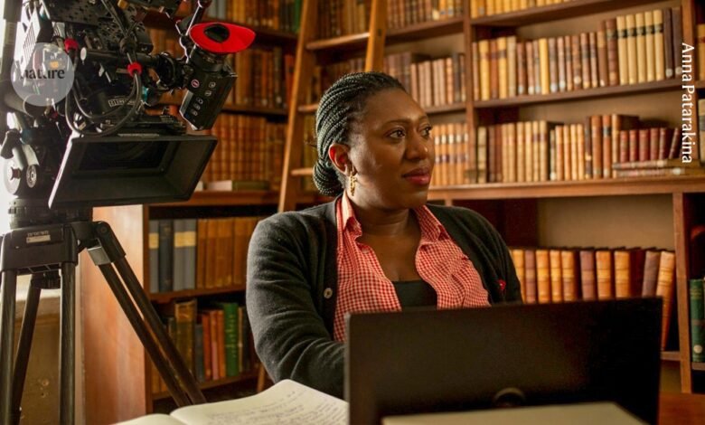 Patricia Kingori sitting at a desk in an old fashioned library with a large video camera behind her
