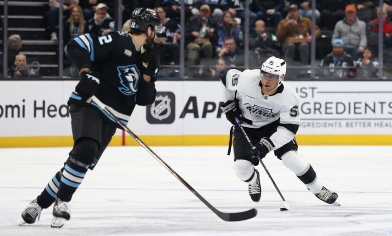 Dec 8, 2025; Salt Lake City, Utah, USA; Los Angeles Kings right wing Quinton Byfield (55) advances the puck against Utah Mammoth center Jack McBain (22) during the first period at Delta Center. Mandatory Credit: Rob Gray-Imagn Images Joel Armia scored two goals for the Los Angeles Kings in a 4-2 win against the Utah Mammoth on Monday night in Salt Lake City.