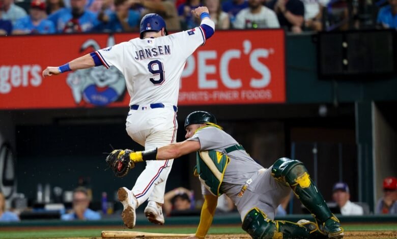 Apr 25, 2026; Arlington, Texas, USA; Texas Rangers catcher Danny Jansen (9) scores at home plate as Athletics catcher Austin Wynns (29) attempts to make the tag during the third inning at Globe Life Field. Mandatory Credit: Kevin Jairaj-Imagn Images Josh Jung hit a go-ahead, two-run homer in the sixth inning as the Texas Rangers beat the Athletics 4-3 on Saturday in Arlington, Texas.
