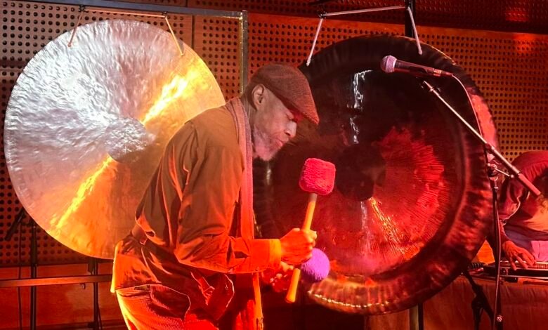 The music was slow and droning. Ghadry sang wordlessly and played his gongs while LARAAJI worked magic with an autoharp (a zither that allows the player to automatically mute non-chord tones with built-in bars), his instrument of choice for the past 50 years and the one that’s made him a mononymous experimental music icon of the 20th and 21st centuries. Warm-up aside, the performance was understated and reflective. Some in the crowd stood, some sat on the floor; everyone looked at once relaxed and locked into the glacial sounds the two men made: Ghadry struck his gongs methodically, letting the slow crashes resonate. LARAAJI bowed, plucked, tapped, and looped his autoharp, stringing its sounds through subtle effect chains with a synthesizer. Half an hour later, the duo stopped naturally. If any physical cue was given from one to the other, I missed it.