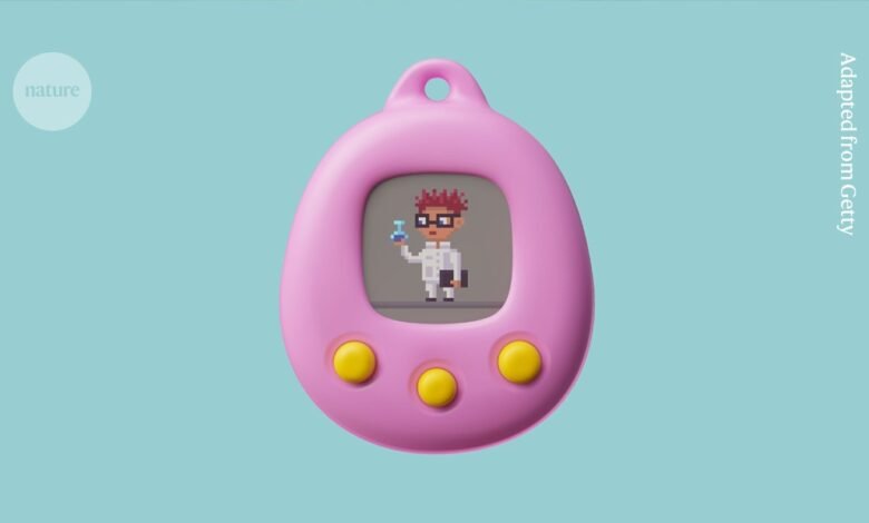 A photo illustration of a pink egg-shaped electronic toy, with a pixel drawing of a scientist holding a flask on the screen