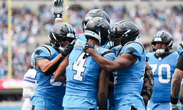 Oct 12, 2025; Charlotte, North Carolina, USA; Carolina Panthers wide receiver Tetairoa McMillan (4) celebrates a touchdown during the second half the Dallas Cowboys at Bank of America Stadium. Mandatory Credit: Cory Knowlton-Imagn Images