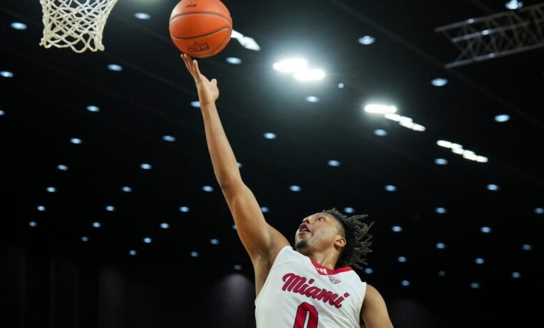 Feb 13, 2026; Miami, Ohio, USA; Miami (OH) RedHawks forward Eian Elmer (0) drives to the basket against the Ohio Bobcats in the first half at Millett Hall. Mandatory Credit: Aaron Doster-Imagn Images No. 23 Miami (Ohio) will try to move a step closer to an unbeaten regular season when it faces Massachusetts in a Mid-American Conference matchup Tuesday night in Amherst, Mass.