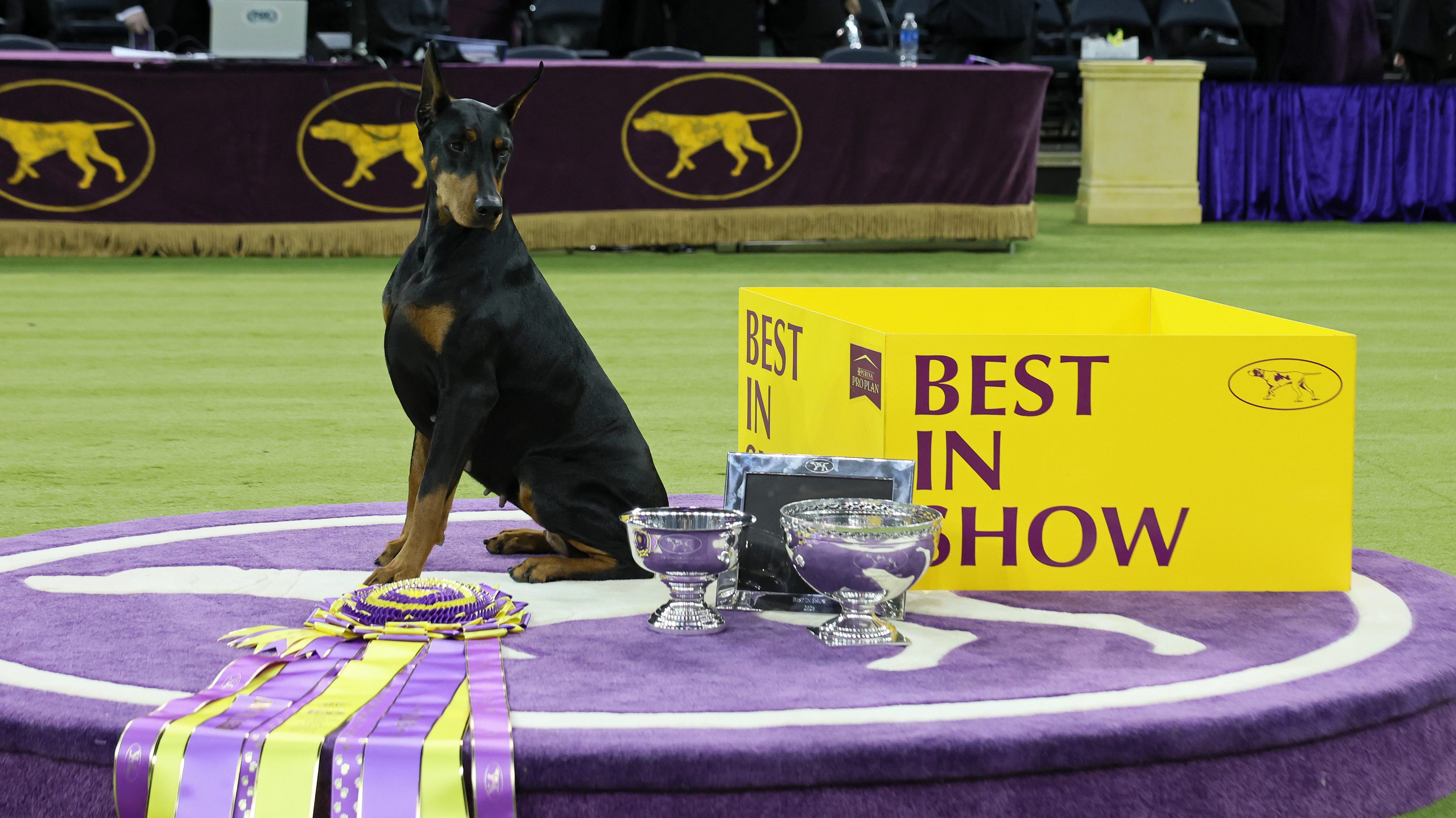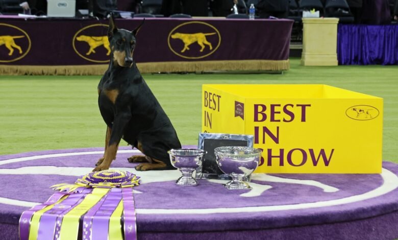 A Doberman pinscher named Penny won best in show Tuesday night at the Westminster Kennel Club Dog Show, netting U.S. show dogs’ most coveted prize — and giving veteran Andy Linton another win after nearly four decades. Linton got best in show in 1989 with another Doberman, named Indy.