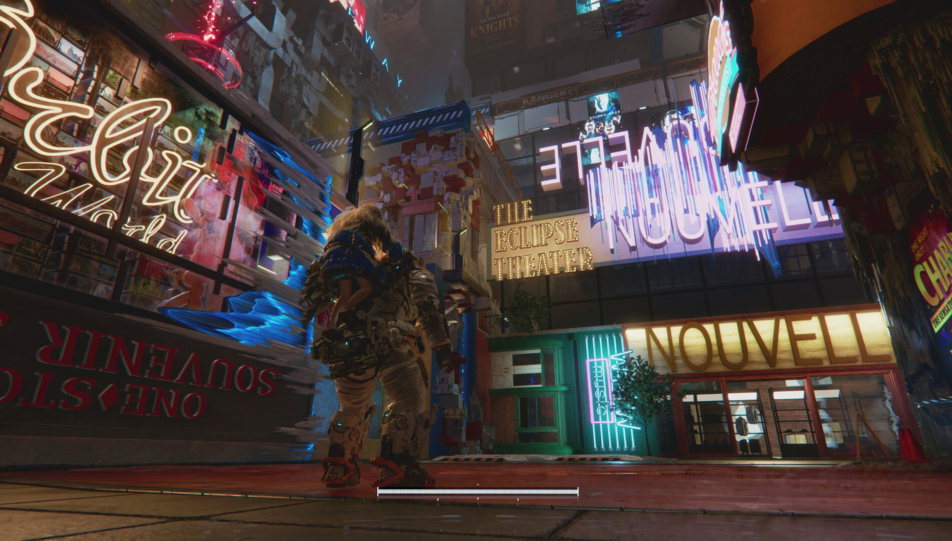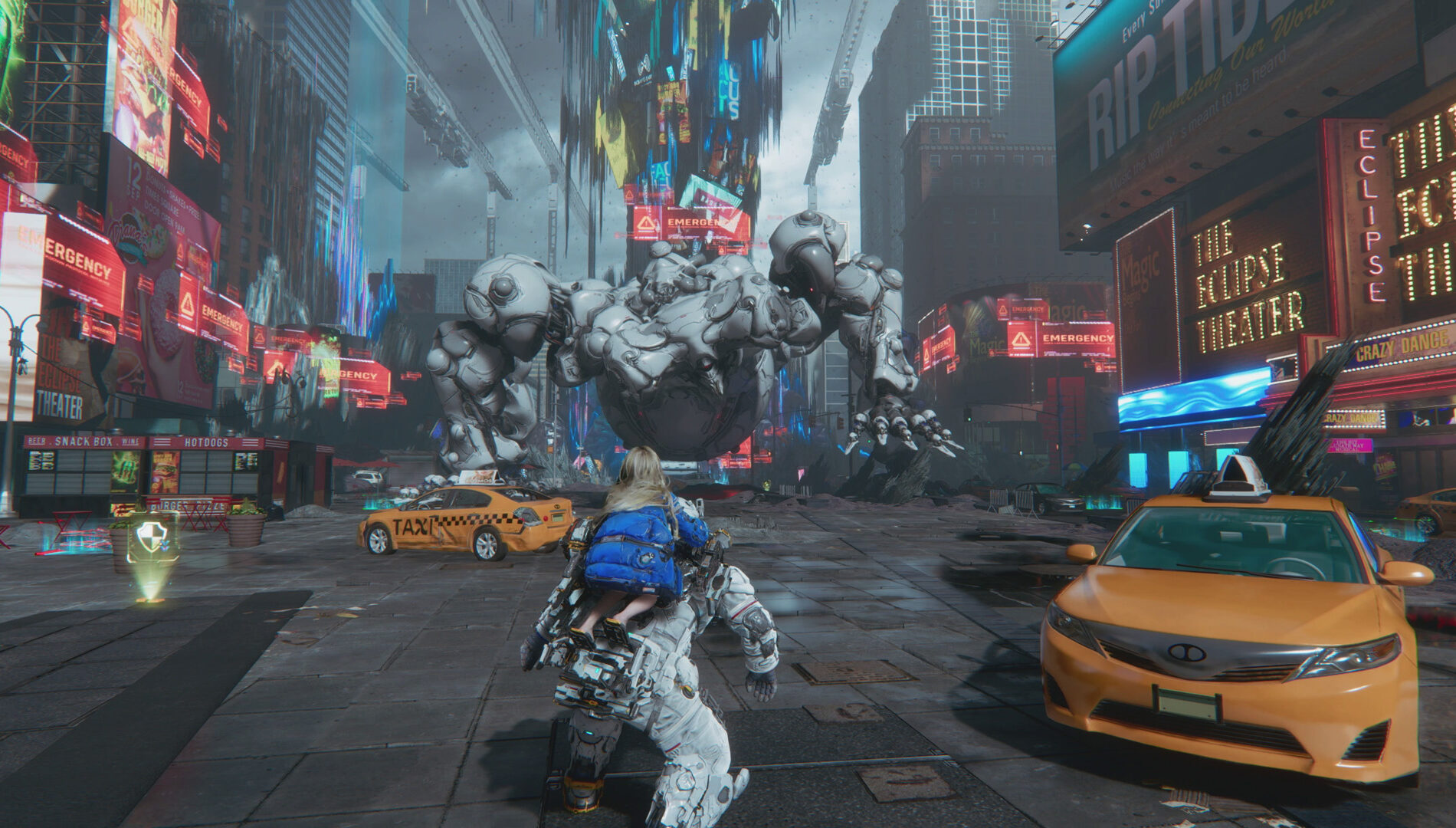 And that sense of fun translates into the levels themselves. Almost immediately after I begin, Hugh discovers that the base’s owners have attempted to recreate an entire section of New York on the Moon – and this is the setting for the entire level to follow. Hugh and Diana travel down gorgeously neon-lit, Times Square-like streets, constantly switching you from combat, to platforming, to puzzle-solving as you travel. Along the expected path through the level, there are unlockable challenge rooms, secret areas to discover, and dozens of items to collect.