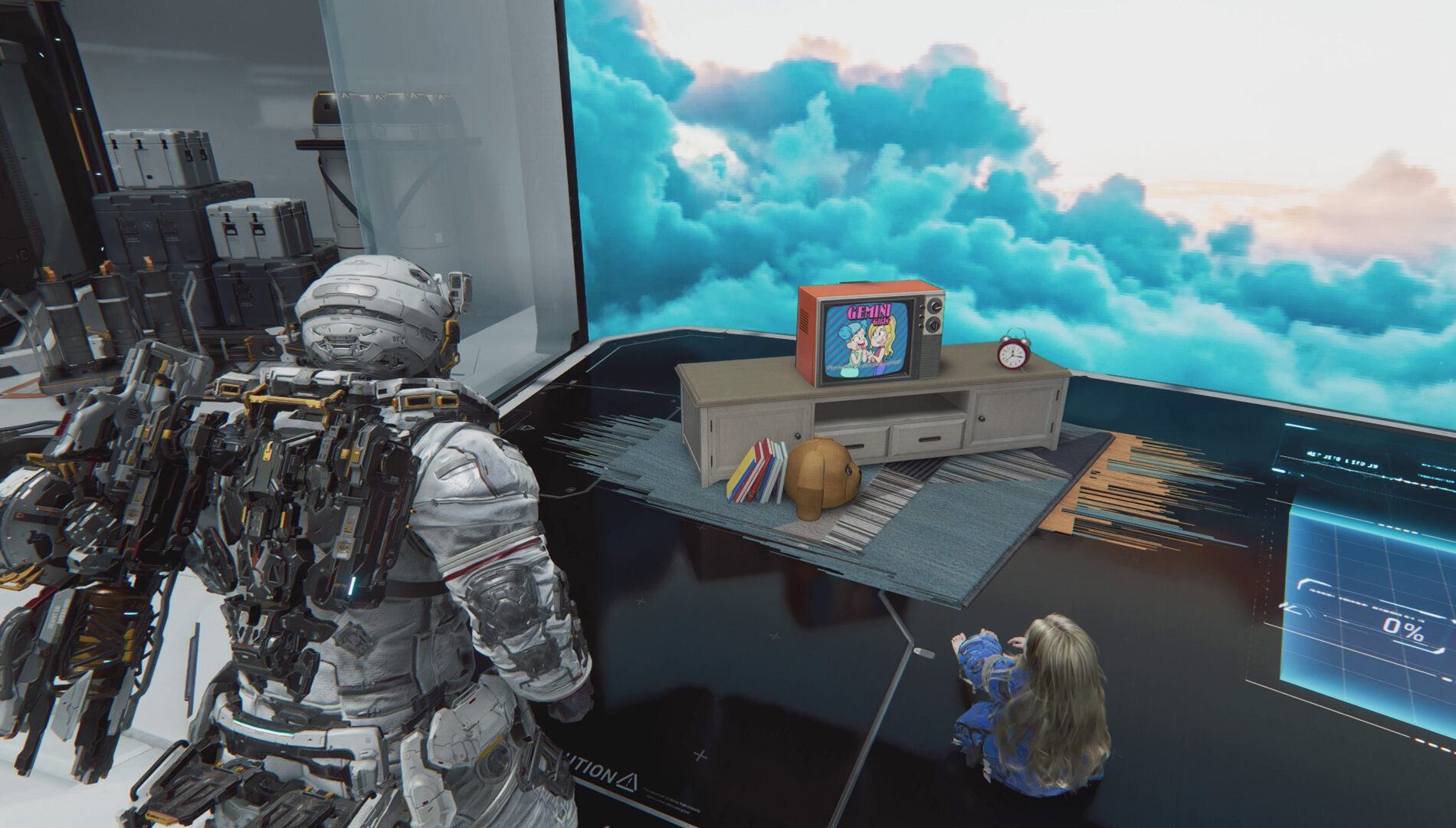 And then there’s Diana herself, who wanders the area, responding to what you’ve been doing in the wider story and offering chances for you to have a quick chat. After chatting enough, I was treated to a genuinely lovely cutscene where she offers Hugh a crayon-drawn portrait of the two of them. It could easily slip into being throwaway or mawkish, but there’s a knowing silliness to so much of Pragmata that helps it all feel part of a wider picture.