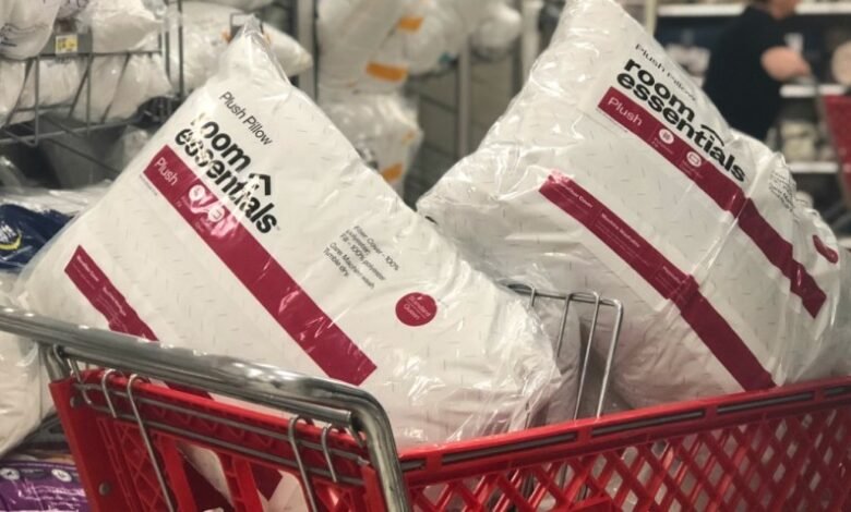 Target shopping cart with Room Essentials pillows in it
