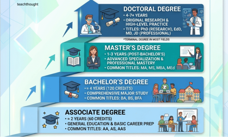 Overview of associate, bachelor’s, master’s, doctoral, and professional degrees—definitions, common titles, typical length/credits, example jobs, and .edu sources. [Updated]