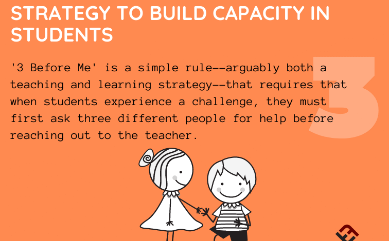 ‘3 Before Me’ is a simple classroom strategy–arguably both a teaching and learning strategy–that requires that when students experience a challenge, they must first ask three different people for help before reaching out to the teacher.