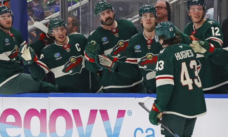 Jan 31, 2026; Edmonton, Alberta, CAN; The Minnesota Wild celebrate a goal scored by defensemen Quinn Hughes (43) during the second period against the Edmonton Oilers at Rogers Place. Mandatory Credit: Perry Nelson-Imagn Images The Minnesota Wild thumped the host Edmonton Oilers 7-3 on Saturday night to complete a sweep of the three-game season series between the clubs.